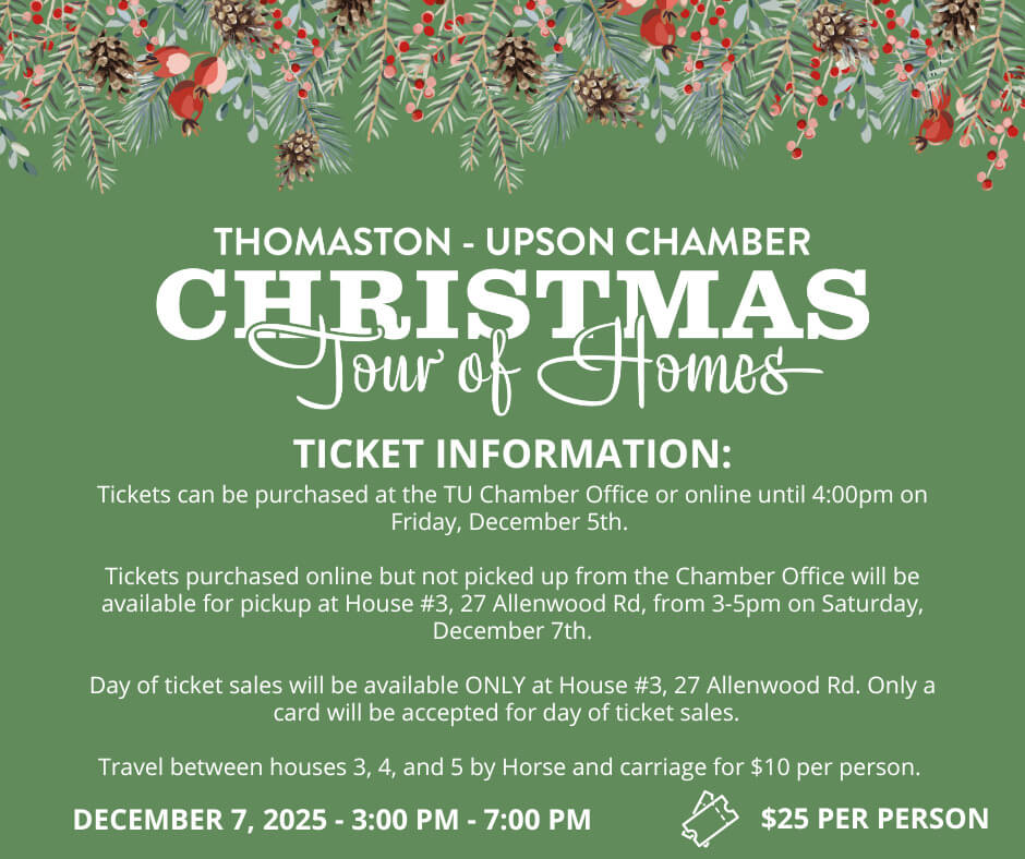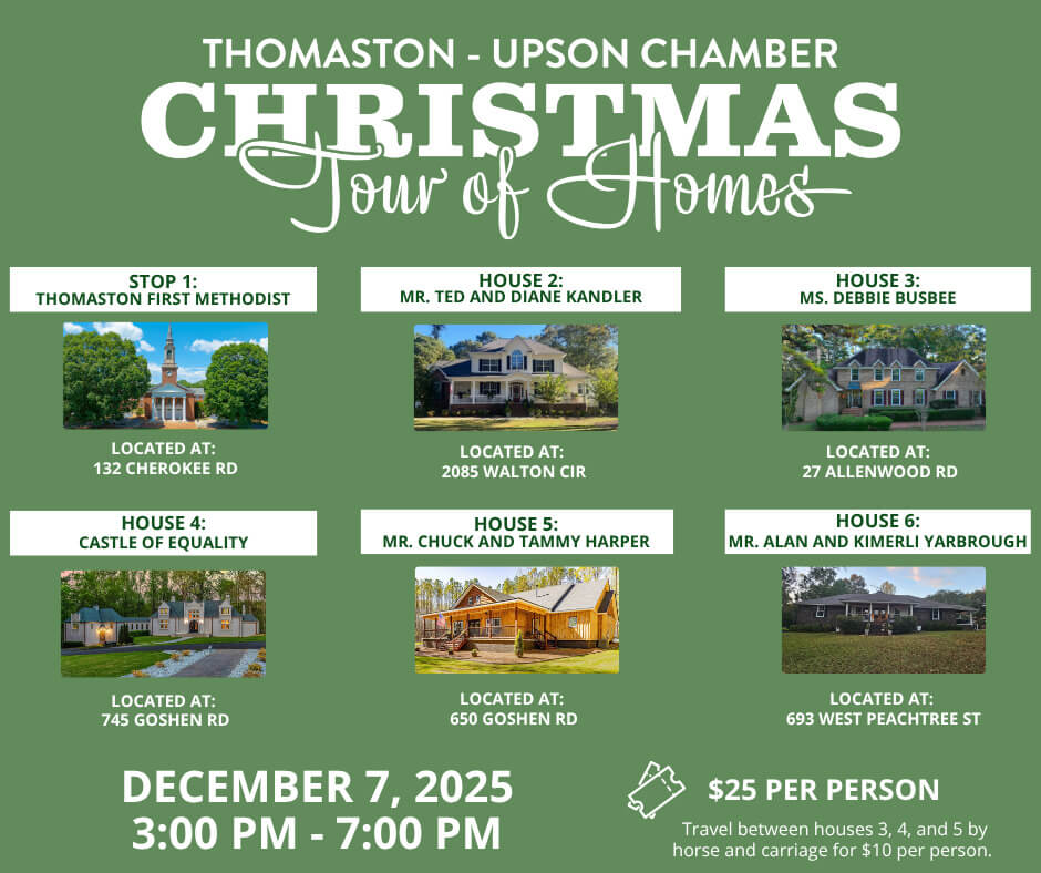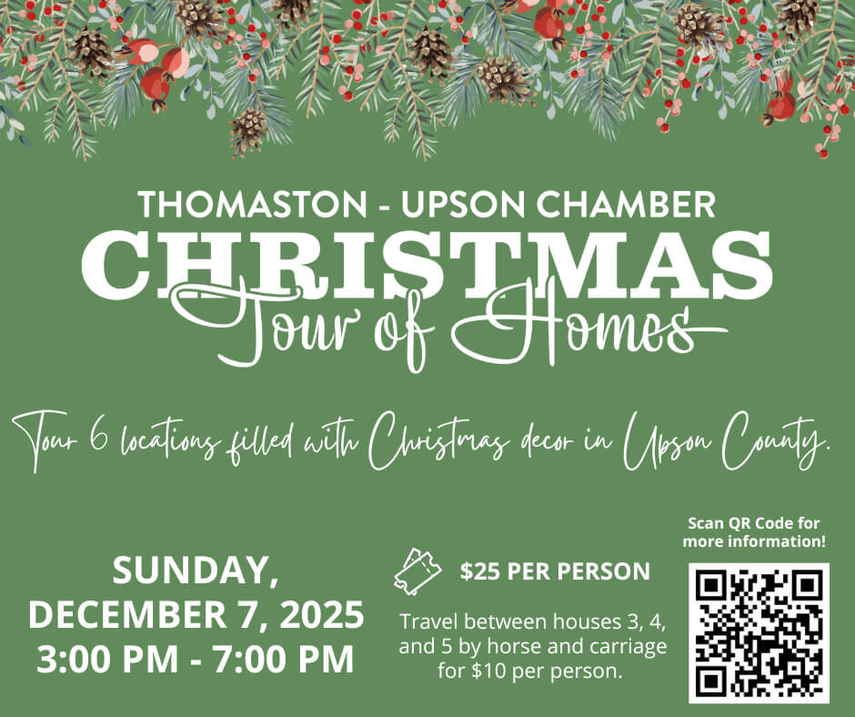 Thomaston-Upson Chamber of Commerce presents Christmas Tour of Homes. December 7th from 3pm-7pm travel around Upson County to view 6 locations filled with Christmas decor, history, and beauty!